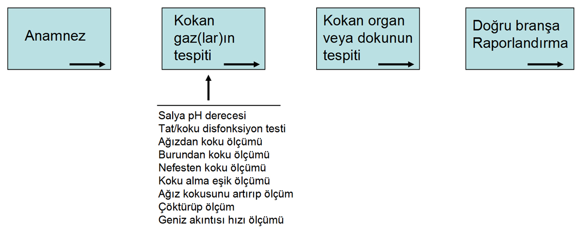 1 defalık pipet veya şırınga ile ağızdan koku ölçerek bir kaç dakikada bir kaç gazı ölçerek ağız kokusuna teşhis konulamaz. 3 ayrı yerden (ağızdan burundan nefesten) kışkırtarak ve durağan koşullarda yüzlerce gazı ölçmek gerekir. Saatler sürer. Resim tıklanırsa muayene algoritması görülebilir.